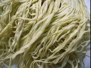 土家綠豆粉主要是用石磨或打磨機將大米和綠豆磨出粉漿后,用漏斗一圈一圈在平底鍋內(nèi)旋轉(zhuǎn),烙一兩分鐘起鍋就是一圈一圈的粉條,下鍋焯一下根據(jù)口味加上牛肉、雞雜、雜醬等一碗美味的綠豆粉就出鍋啦。