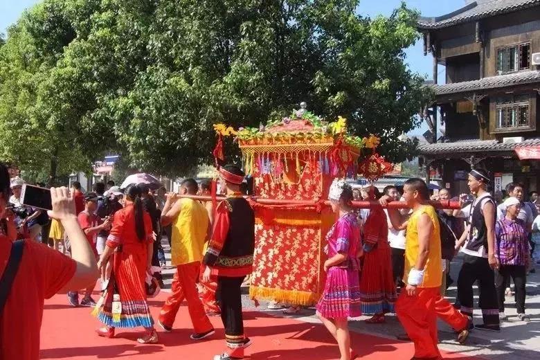 桃花好,朱顏巧;鳳袍霞帔鴛鴦襖。彩旗飛揚,華蓋端莊遇上了乞巧節(jié),黔江土家女兒會演繹傳統(tǒng)土家婚禮。濯水古鎮(zhèn)洋溢著紅色的喜悅。從恩施趕來的娶親團抵達濯水古鎮(zhèn)。先喝攔門酒,再陪十姊妹。原汁原味的土家嫁女風(fēng)俗盛大開幕