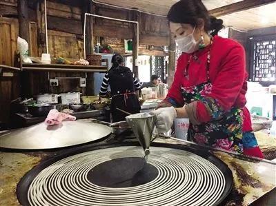 烙:先將大鐵鍋涂上菜油,然后迅速在漏斗里灌滿米漿,以鍋為紙,以漿為墨,從鍋的邊緣開始,均勻的米漿從細細的漏斗口流到鍋面上,由外向內(nèi),恰似一個個大小不一的同心圓,當圓圈畫到鍋的最中心,漏斗里的漿也剛好用盡。