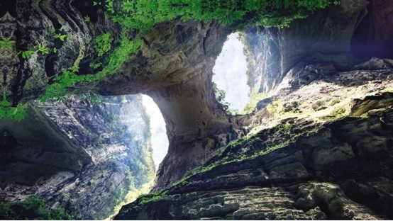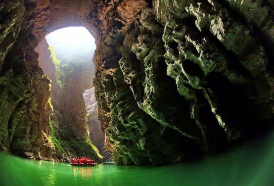 在暗河三橋中間有兩個橢圓形的漏斗,高度均在100米左右。其中三橋和二橋之間的“天眼”寬度為41米,二橋和一橋之間的“天眼”寬度為52米,而天生二橋的橋梁寬度約25米,這樣的一個黃金比例使得我們船行至此抬頭仰望,二橋的橋梁仿如仙子的鼻梁,一對漏斗分立兩邊,仿如一雙“天眼”頓開讓人驚艷。這里便是蒲花暗河最核心的景觀“蒼天有眼”。廩君的族人相信,“人在做天在看”,他們保持著對自然和天道的最高敬畏,今天的濯水人也時刻敬畏天理,講究良心。這里的“蒼天有眼”渾然天成,與濯水古鎮(zhèn)上的“天理良心”道德碑遙相呼應,共同構筑了濯水景區(qū)“上蒼有天眼,人間有良心”的活的靈魂。