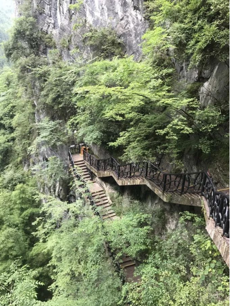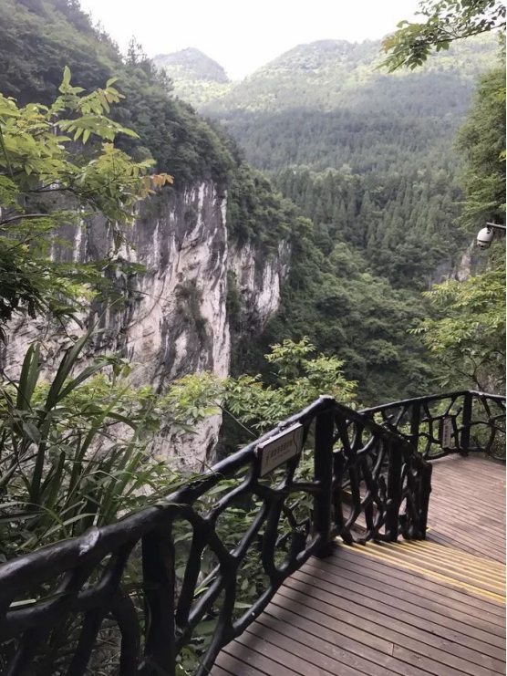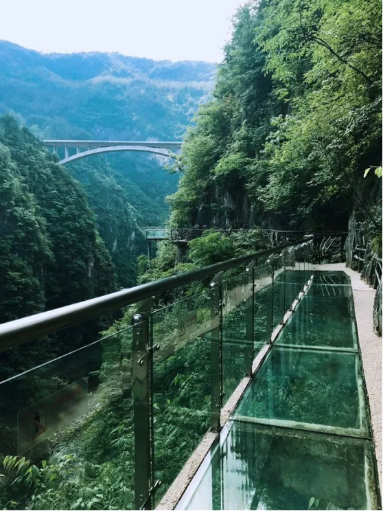 峽谷峭壁直立,崖壁大多與地平線成直角。當(dāng)你走上808米長的空中棧道,尤其是懸掛在500米高空的透明玻璃棧道,大有“我要飛”的刺激感;