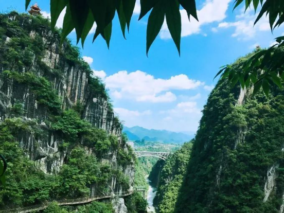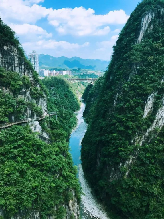 黔江 “芭拉胡”自然融合度高,氣勢宏大。登高遠(yuǎn)望,恰似一條綠色絲絳,將老城 新城 逢合在一起,繪就一幅名副其實的“城即景、景即城”的水墨丹青。谷寬80-100米,平均深度200米,最大落差500米;