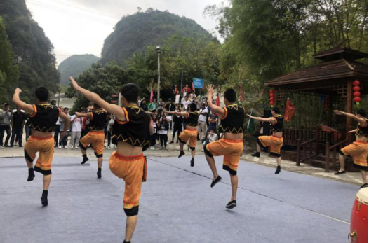 到達(dá)景區(qū)內(nèi)的第一個(gè)項(xiàng)目便是南溪號(hào)子。南溪號(hào)子流行于重慶市黔江區(qū),淵源要追溯到唐朝,它的雛形是土家族農(nóng)民在勞動(dòng)中解乏鼓勁的勞動(dòng)號(hào)子和山歌號(hào)子,與薅草鑼鼓近似。喊號(hào)子一般不少于7人,1人領(lǐng)唱,2人或3人扮尖聲(高音),其他人唱低音,眾人幫腔。2006年,南溪號(hào)子列入國(guó)家級(jí)非物質(zhì)文化遺產(chǎn)名錄。