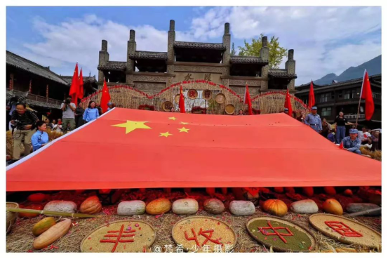 以“喜獲豐收 歡度國慶”為主題重慶黔江獻禮祖國70華誕文化旅游活動在濯水古鎮(zhèn)核心景點內(nèi)隆重舉行,景區(qū)工作人員利用金黃色的玉米、南瓜,大紅的辣椒,以及綠豆、稻草、玉米桿等土地上的實物,增設(shè)了豐收喜慶的生活新場景,制作完成了稻草人、“福祿壽喜財”、白虎、玉米簾、蹺蹺板、網(wǎng)紅秋千等景觀,營造出了濃濃的節(jié)日氛圍,成為了游客爭相拍照打卡的網(wǎng)紅地標(biāo)。