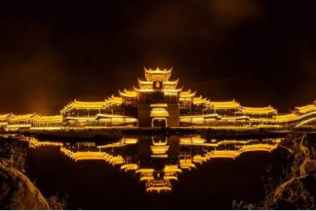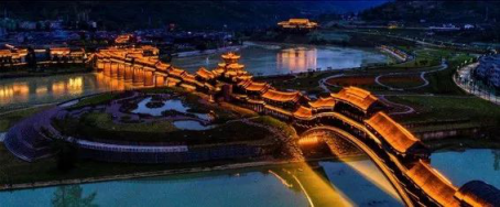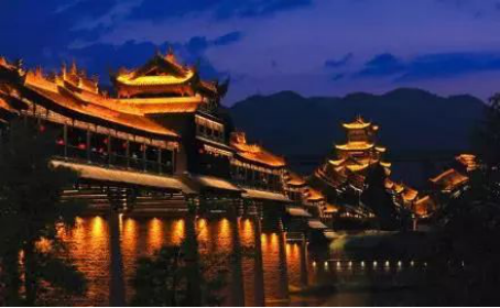 風(fēng)雨廊橋的形態(tài)也是豐富多彩,有“濯河懷遠”、“唐鐘長韻”,“彩虹伏波”、“蒲花飛龍”四段,入夜之后,宛如一條金色游龍,氣象萬千,煞是壯觀,是中國少數(shù)民族特色建筑景觀的突出代表,堪稱中國廊橋文化藝術(shù)品的典例!