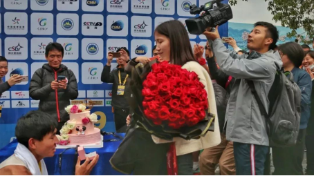 摘得本次比賽42公里男子組冠軍的駱濤沖過(guò)終點(diǎn)以后,單膝跪地,向在終點(diǎn)等候自己的女朋友求婚!