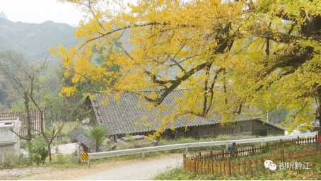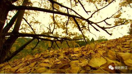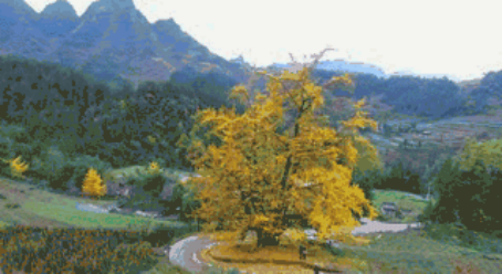 從高處俯瞰,黃紅相間的山林中,銀杏古樹最為顯眼。樹干上數(shù)不清的黃葉閃爍,如同披上了金色的外衣,色彩斑斕、美妙如畫。陣陣微風拂過,不斷掉落的葉片似金蝶翩翩起舞。