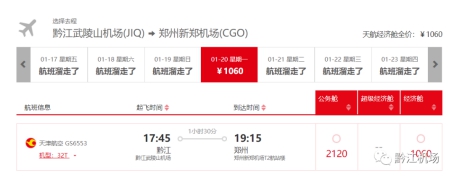 “黔江—鄭州”經(jīng)濟(jì)艙全價(jià)1060元