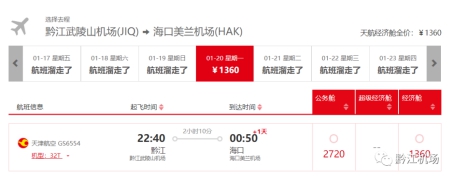 “黔江—海口”經(jīng)濟(jì)艙全價(jià)1360元