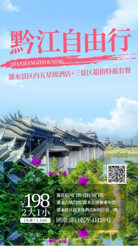 黔江自由行優(yōu)惠來啦,198元一家三口即可快樂出游,江景房、金牌景點(diǎn)全含,識(shí)別圖中二維碼即可購買!