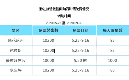好消息來咯!5月25日—9月30日期間,黔江芭拉胡景區(qū)、蒲花暗河景區(qū)、愛莉絲莊園景區(qū)、水車坪景區(qū)對四川籍游客免費贈送門票,趕緊來看看!
