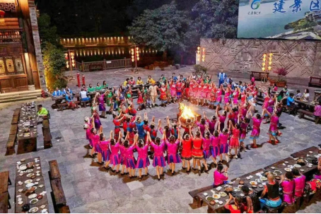夏天的時(shí)候,從周一到周天,只要是天氣晴好的夜晚,在古鎮(zhèn)戲樓前都會(huì)舉辦篝火晚會(huì)表演。游客們?cè)诋?dāng)?shù)鼐用竦膸ьI(lǐng)下,圍著熊熊篝火,伴著音樂跳起了土家擺手舞,領(lǐng)略土家文化的魅力。