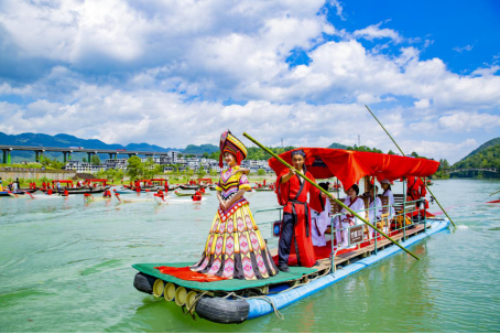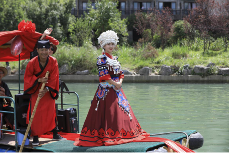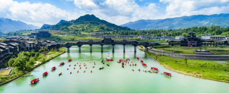 23日上午,古鎮(zhèn)、廊橋上早已是門(mén)庭若市、熱鬧非凡,從廊橋放眼望去,環(huán)繞著廊橋的阿蓬江上,一只只大紅船載著新人的幸福喜悅緩緩駛來(lái),船只上歌聲裊裊、舞蹈飄飄,喚起了古鎮(zhèn)上的單身男女對(duì)愛(ài)的憧憬…