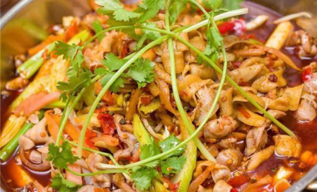 黔江雞雜選剛宰殺出來(lái)的本地土雞新鮮雞雜,佐料使用上要求味大,去腥能力強(qiáng),因而高辣度的泡椒,和酸味濃烈的老壇泡蘿卜是主要輔料。經(jīng)過(guò)多年發(fā)展,黔江雞雜已經(jīng)由原來(lái)的一盤(pán)小菜,發(fā)展成干鍋、煨鍋、火鍋、禮品包裝、即時(shí)吃食品等系列美食。