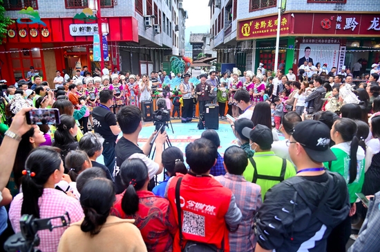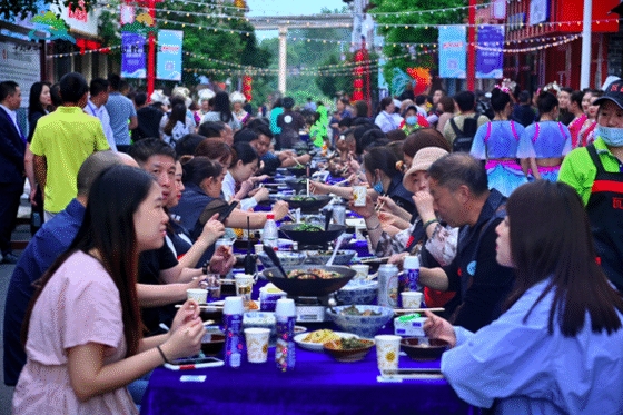 “上雞雜啰!”5月19日,中國旅游日,重慶黔江5A景區(qū)濯水古鎮(zhèn),一場盛大雞雜夜宴熱鬧開席,來自全國各地的游客和當?shù)氐拿朗硱酆谜呓?00人一起享用久負盛名黔江雞雜。