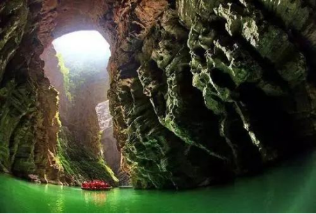來暗河感受三天兩夜穿越之旅。一艘艘的游船躺在水面上,水綠得像是碧玉那般。