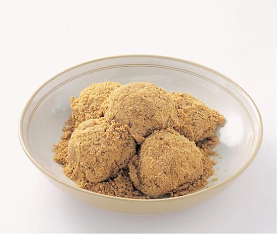 湯圓的一種獨特的吃法。由炒過的黃豆粉拌芝麻、白糖等制作而成,沾滿黃豆末和白砂糖后即可食用。吃時滿口..