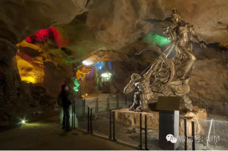 又一群寬翅膀的蝙蝠從頭頂飛過(guò),拐過(guò)一個(gè)彎,眼前洞壁豁然開(kāi)朗,洞頂很高,四壁異常開(kāi)闊,在彩燈的映照下,這個(gè)如大廳般的洞穴中央,居然矗立著一座巨型的人物雕塑,其名曰:“廩君與鹽水女神”。一個(gè)肌腱壯實(shí)的椎髻男子,跪蹲在下,手挽強(qiáng)弓,仰視天上;另一個(gè)則是裙裾飄飄的女神,裊裊在上,含情脈脈地俯視地上的情人。哦,這不就是巴人先祖的創(chuàng)世紀(jì)嗎?據(jù)說(shuō),穴居于武落鐘離山的巴氏子務(wù)相,其所居的巖洞名叫赤穴,他通過(guò)擲劍,浮舟兩項(xiàng)競(jìng)技,成了由五個(gè)氏族所組成的部落的首領(lǐng),其名號(hào)曰“廩君”。在一次部族大遷徙途中,他在夷水北岸的鹽陽(yáng),邂逅了那位美麗而多情的女酋長(zhǎng),女酋長(zhǎng)即鹽水女神,她對(duì)年輕英武的廩君一見(jiàn)鐘情,于是,她邀請(qǐng)客人住進(jìn)山寨,隨即便墜入愛(ài)河不能自拔。他倆日夕相伴,郎情妾意,繾綣纏綿,甜蜜得令眾人嫉妒又艷羨。說(shuō)來(lái)也奇,這塑像不遠(yuǎn)處便有一景點(diǎn)名曰“千丘梯田”,一彎彎田隴活靈活現(xiàn),而田隴之后更有層層疊疊的石筍和石鐘乳,恍若一片蓊郁的竹樹(shù),竹樹(shù)間影影綽綽,那不就是鹽水女神的村落與家園么?這位美麗的女酋長(zhǎng),曾對(duì)稟君夸耀過(guò)她世居的領(lǐng)地很富庶,既有肥美的魚(yú),又有豐富的鹽。